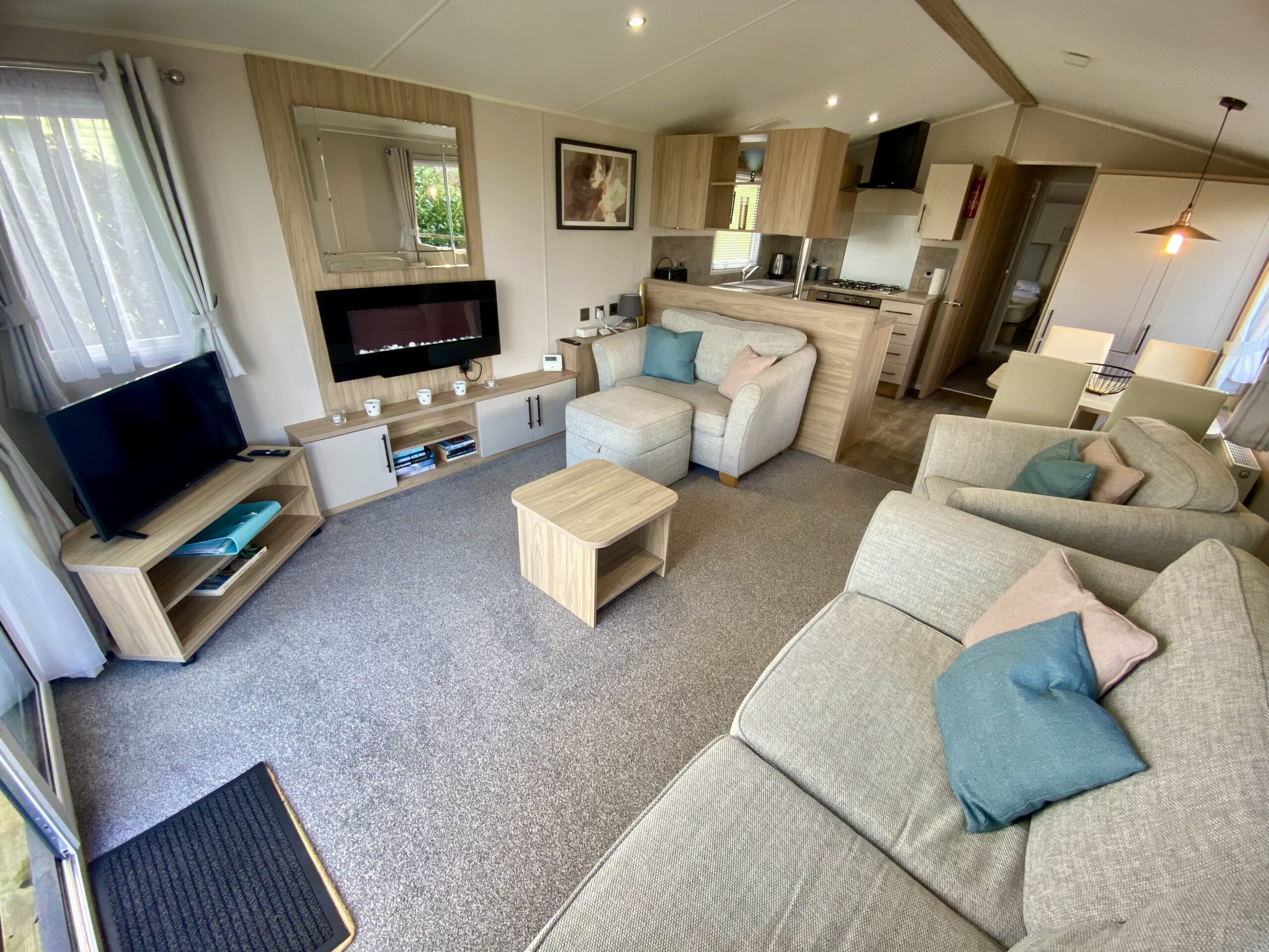 At the heart of the home is a bright, open-plan living space. The fully equipped kitchen includes an integrated fridge freezer and washer dryer, making longer stays effortless. The lounge is warm and inviting, with two freestanding sofas and an armchair, ideal for relaxing after a day exploring the coast.